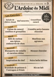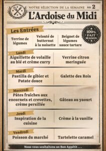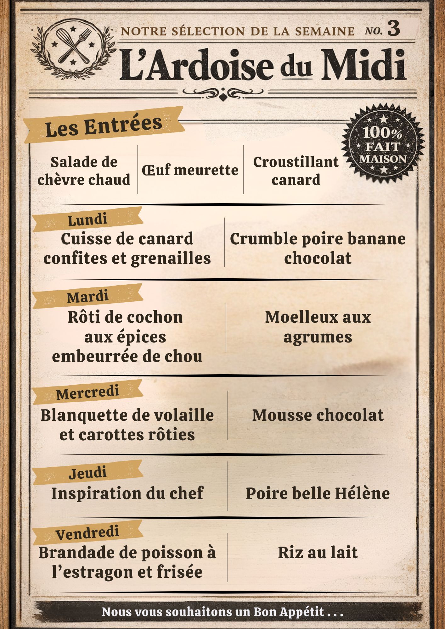 Les plats doivent être commandés 30 minutes à l’avance, du lundi au vendredi, pour un retrait au Bateau Ivre de Migné-Auxances à partir de midi.